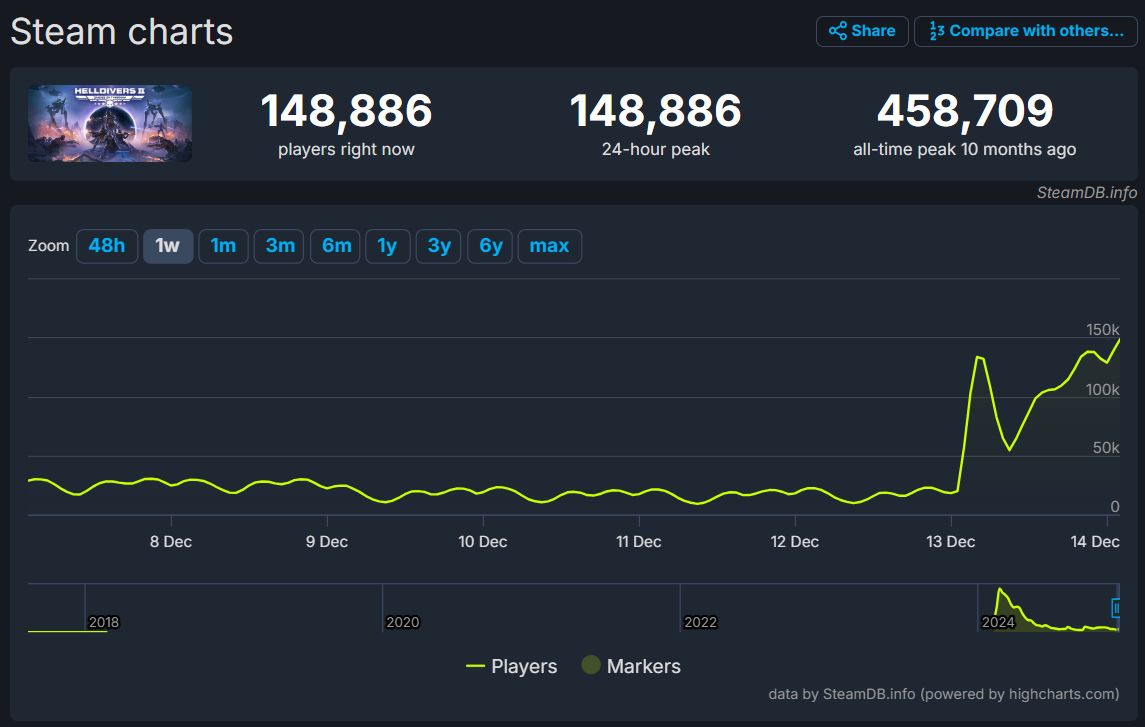 在过去的几周里,《绝地潜兵2》在Steam上的平均在线玩家数为20,000-30,000人,但根据SteamDB的最新数据,自上述更新上线以后,《绝地潜兵2》在Steam上的在线玩家数量已攀升至148,886人。