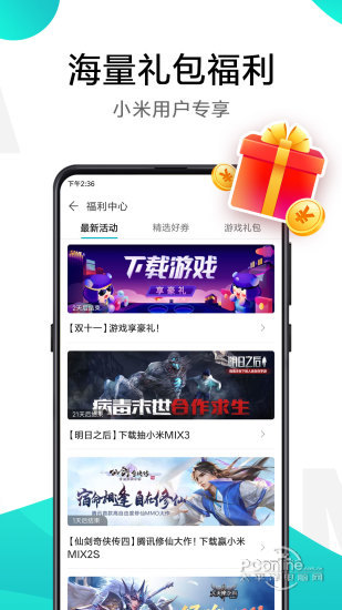 3.各种福利活动,玩游戏全网最低价,大尺度充值返利、下载游戏抽取小米明星产品、假日0元抢米币、专属礼包领不停。