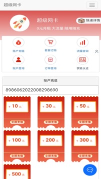 本APP为网卡用户管理系统。主要的应用功能有:账户充值(充值账户金额)、套餐订购(客户可以根据自己的需求,购买适合自己的流量套餐)、流量查询(查询网卡的流量使用情况,方便客户管理)、账户查询(客户查询账户级别信息,包括用户名、卡内余额、ICCID等信息)、订单查询(查询客户的订单基础信息)、实名认证(依据国家规定,进行实名认证)。