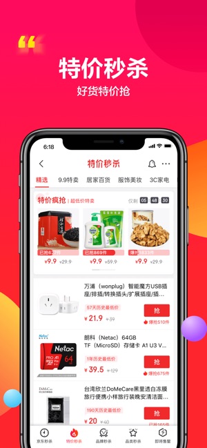 掌上秒杀、手机专享、降价排行、优惠券、限时满减等,优惠多多