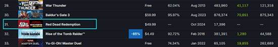 《荒野大镖客:救赎》PC版已启动预售。据了解,该游戏在Steam国区售价为249元人民币,而在美区则需支付49.99美元(约合353元人民币)。截至发稿时,根据SteamDB的最新统计数据,《荒野大...